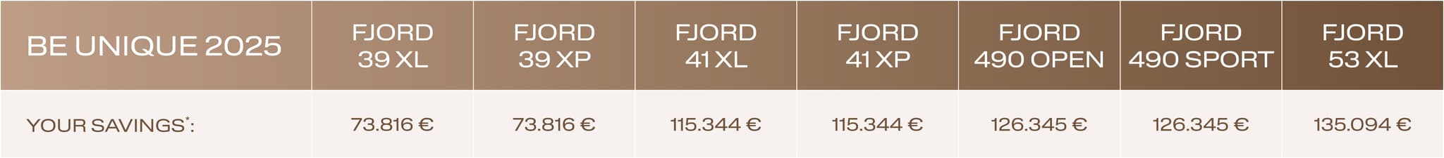 (*) Disclaimer: Maximum price advantage based on the Fjord 53 XL, available until 2nd November 2025 for yachts to be delivered most likely not before november 2025, individual may earlier. The price advantage of the Fjord 39 XP is only valid when ordering an engine from the shipyard at the same time. All prices and discounts including 19% German VAT. Prices & price advantages for other markets may vary depending on applicable VAT. May not selected options won't be refund. This special offer cannot be combined with any other price promotions or incentive programmes. Errors excepted.